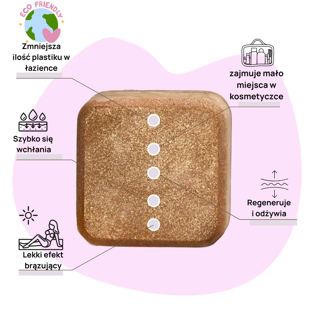 Wegański balsam w kostce intensywnie odżywia skórę i nadaje jej zmysłowy, złocisty blask. Idealnie podkreśla opaleniznę, pozostawiając ciało aksamitnie gładkie. Olśniewaj naturalnym pięknem!