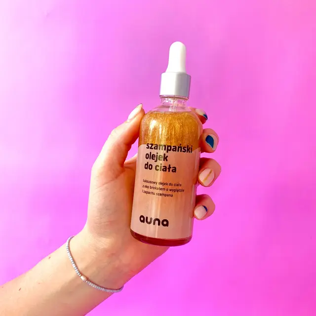 Podaruj sobie odrobinę luksusu, który otula ciało świetlistą aurą i aromatem najszlachetniejszego szampana. Olejek szampański z drobinkami od marki Auna Vegan to wegański rytuał zamknięty w butelce, stworzony z myślą o kobietach pragnących czuć się wyjątkowo każdego dnia. Szlachetne oleje roślinne sprawiają, że skóra staje się jedwabiście miękka, a mineralny pył subtelnie rozświetla ją przy każdym ruchu, podkreślając naturalne piękno. Formuła suchego olejku błyskawicznie się wchłania, nie pozostawiając tłustej warstwy, dzięki czemu możesz cieszyć się aksamitnym wykończeniem tuż przed wielkim wyjściem. To chwila czystej przyjemności i blask, który pozostaje z Tobą na długo.