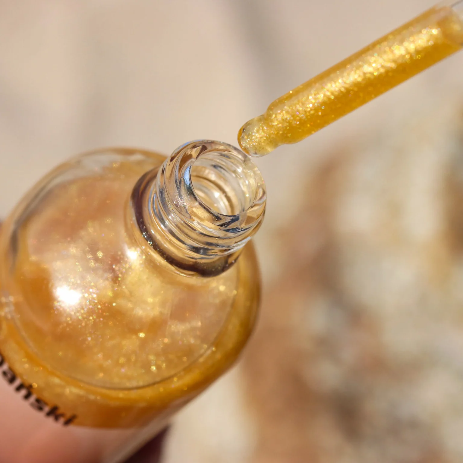 Przed każdym użyciem energicznie wstrząśnij buteleczką, aby złociste drobinki równomiernie wymieszały się z bazą olejową. Nanieś niewielką ilość produktu na dłoń, a następnie wmasuj w czystą skórę ciała, skupiając się na miejscach, które chcesz wyeksponować, takich jak nogi, dekolt czy ramiona. Olejek możesz stosować zarówno na suchą skórę dla intensywnego blasku, jak i na jeszcze wilgotne ciało po kąpieli, aby zatrzymać nawilżenie na dłużej. Dzięki błyskawicznemu wchłanianiu, możesz ubrać się niemal natychmiast po aplikacji.