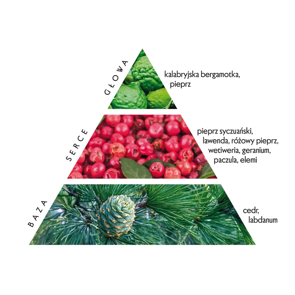 • Nuty serca: pieprz syczuański, lawenda, różowy pieprz, wetiweria, geranium, paczula, elemi