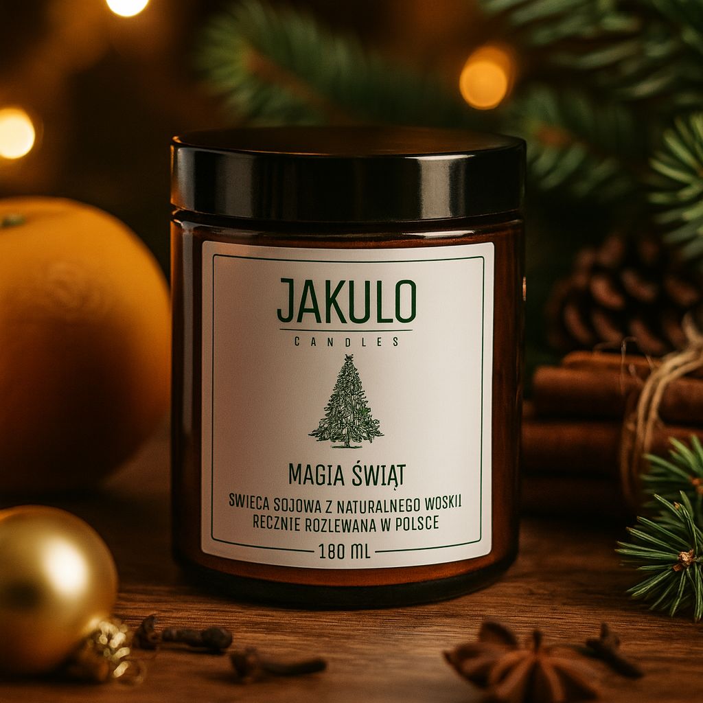 Poczuj, jak Twój dom wypełnia się kojącym ciepłem najpiękniejszych zimowych wspomnień. Świeca sojowa Magia Świąt od Jakulo to wyjątkowa, rzemieślnicza opowieść, w której soczyste nuty pomarańczy i mandarynki spotykają się z rozgrzewającą mocą cynamonu oraz goździków. Ta starannie wyselekcjonowana kompozycja od Jakulo otula wnętrze niczym miękki, wełniany koc, wprowadzając do Twojego butikowego zacisza aurę spokoju i radosnego oczekiwania. Dzięki bazowym akordom drewna i piżma zapach staje się głęboki i niezwykle elegancki. To idealny sposób na celebrowanie chwil bliskości oraz doskonały pomysł na prezent, który wniesie magię do każdego wnętrza.