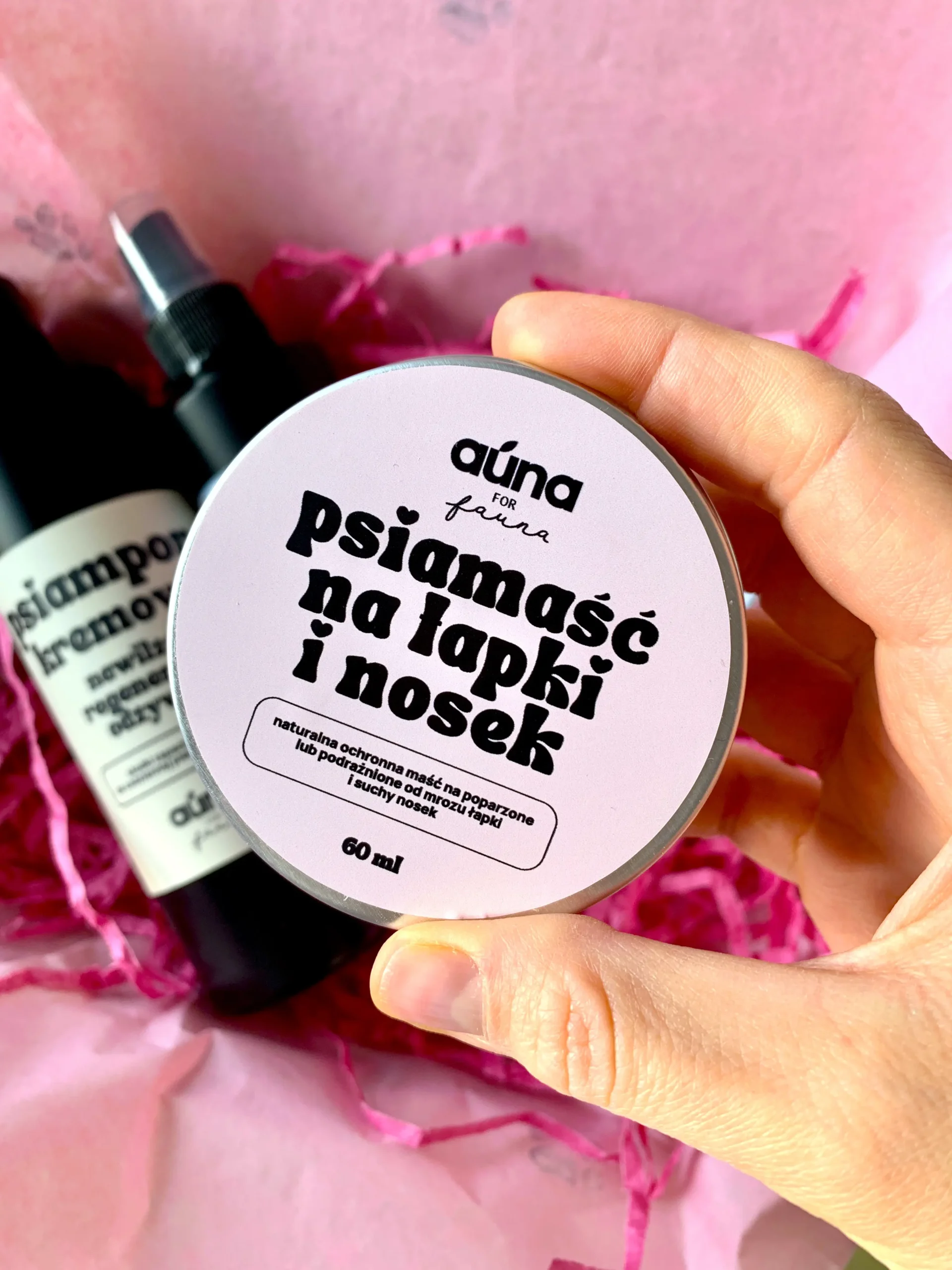 - Psiamaść (30 ml): Kojący balsam na podrażnione łapki i suchy nosek, który tworzy barierę ochronną przed czynnikami zewnętrznymi.